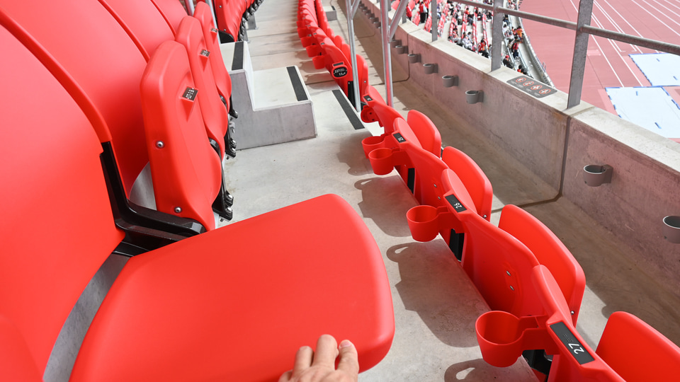 座席エリアの傾斜角で見ると、豊田は最大38度、瑞穂は最大35度。瑞穂の方が緩めに見えるが、バックスタンドで移動してみた限り、上段に上がる際の急角度も、だいたい同程度に感じる。