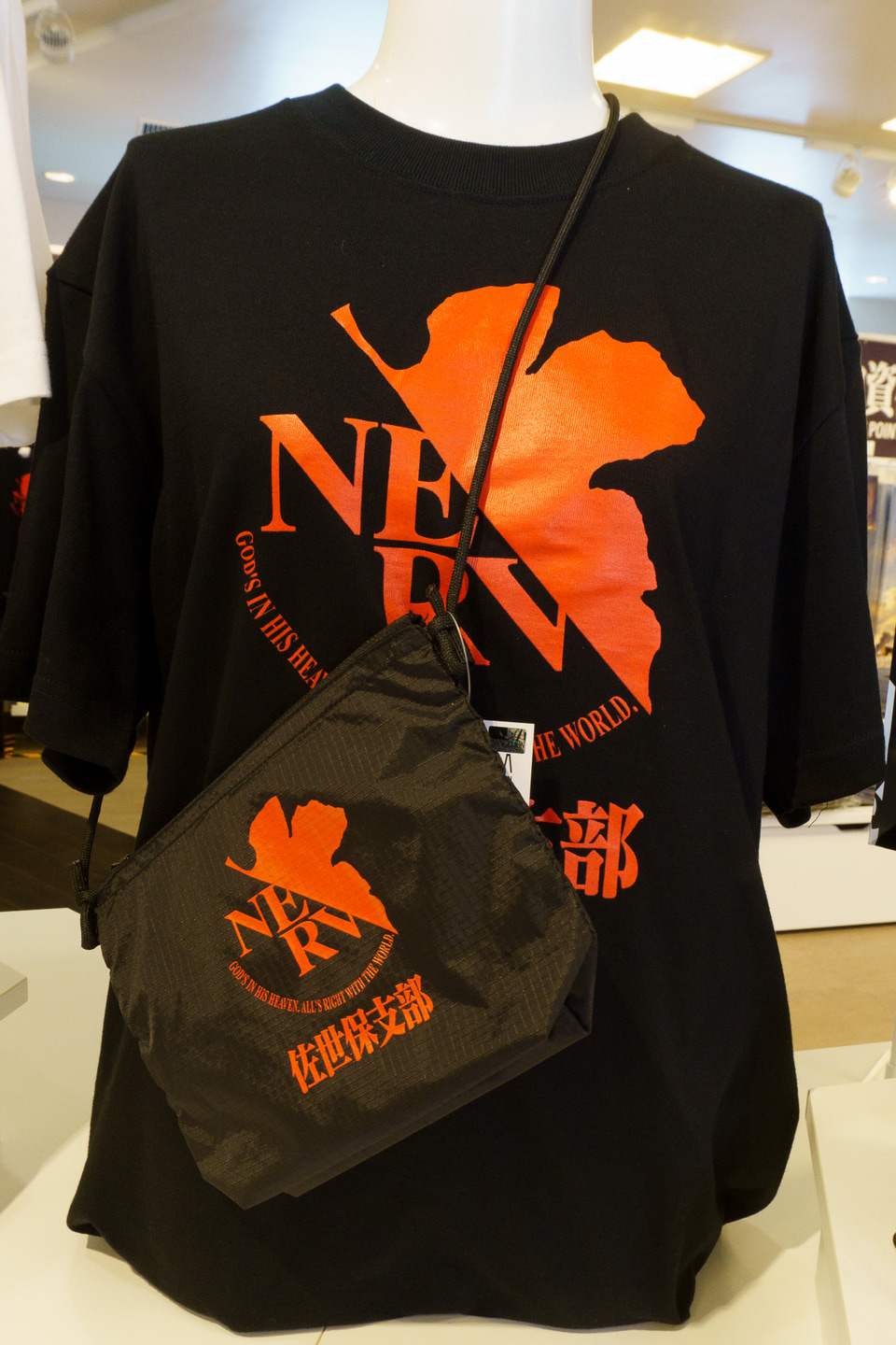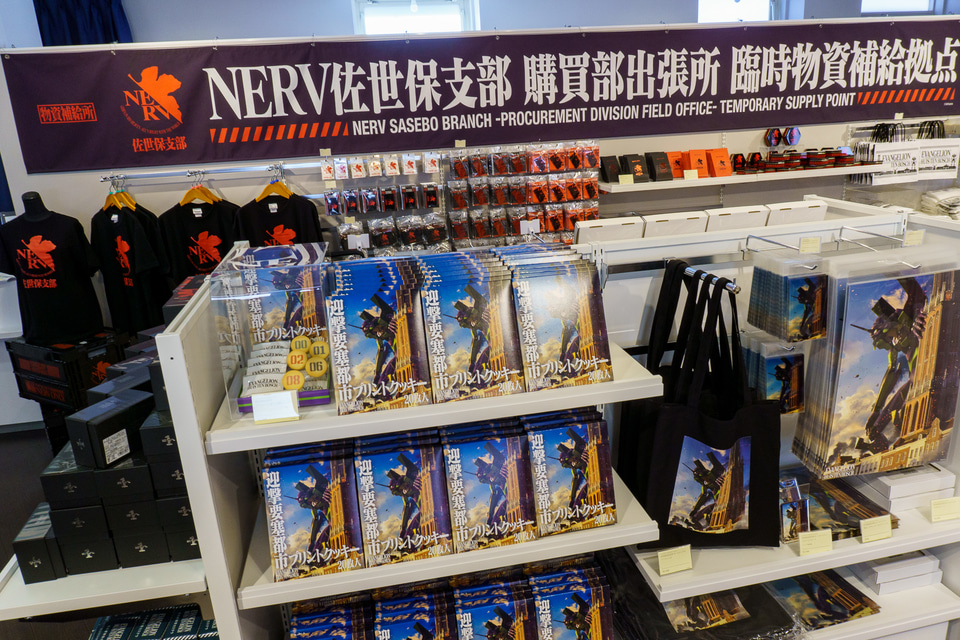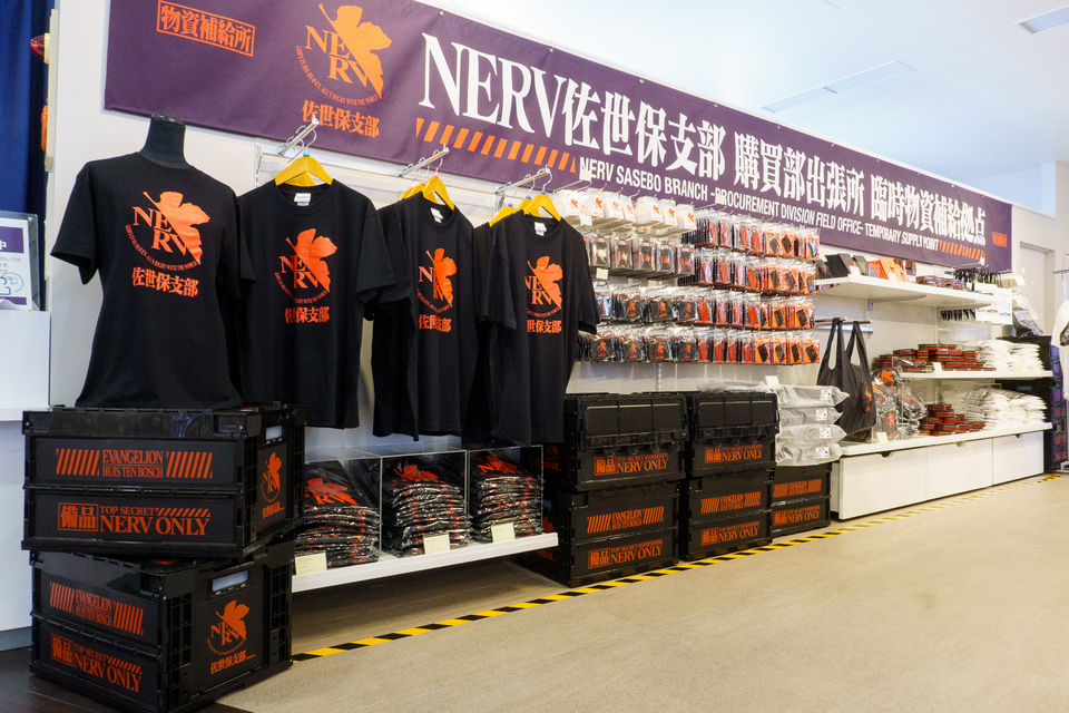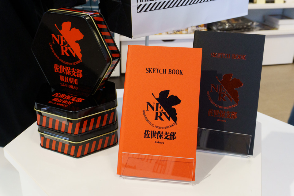 NERV佐世保支部ロゴをあしらったグッズは、Tシャツ(4000円)、ICカードステッカー(600円)、マットな質感のIDケース(2800円)、ポーチ入りエコバッグ(2200円)、折りたためるコンテナ(8500円)など、ネルフ職員気分を楽しめるアイテムのほか、重厚感のある表紙のスケッチブック(900円)、ロゴステッカー(400円)、アクリルロゴキーホルダー(各1500円)、ラムネ缶(950円)が登場する。