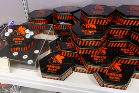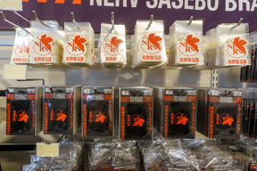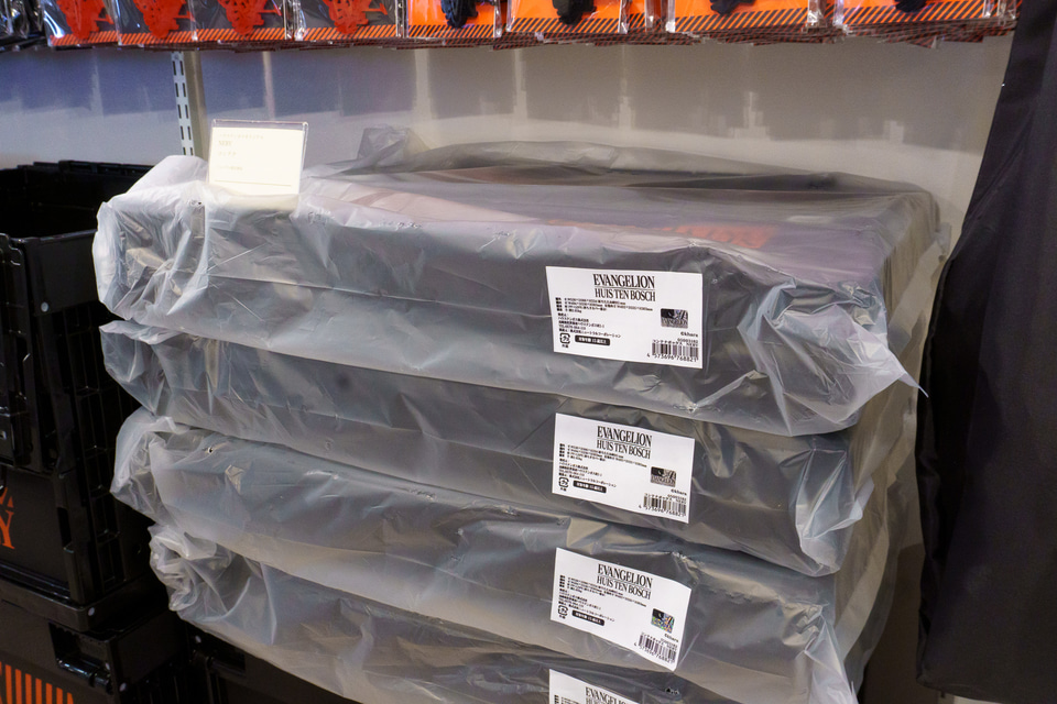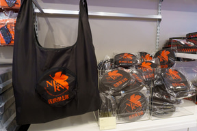 ロゴや初号機がプリントされており、プチギフトに最適な「焼きかま」(各250円)、「日常に溶け込むエヴァンゲリオン」をコンセプトにした公式アパレルブランド「Radio Eva(ラヂオエヴァ)」コラボグッズ(Tシャツ5800円、ランチトート3500円)も取りそろえている。