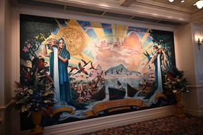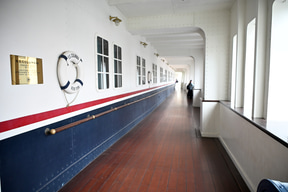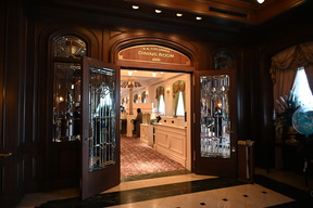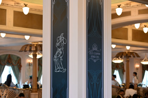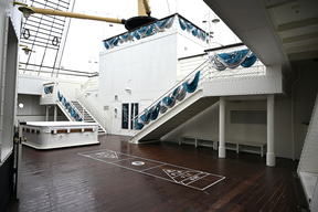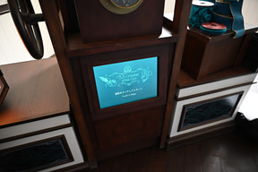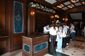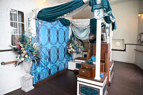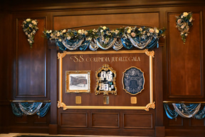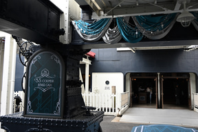 プログラムの開催場所は、S.S.コロンビア号の船上。船内のすべてのフロアを貸し切ってのイベントは東京ディズニーシーの歴史のなかでもかなりめずらしいこと。エントランス部分には、GALAのレッドカーペットを彷彿させる、ジュビリーブルーのデコレーションが施され、参加者を出迎える。