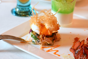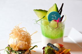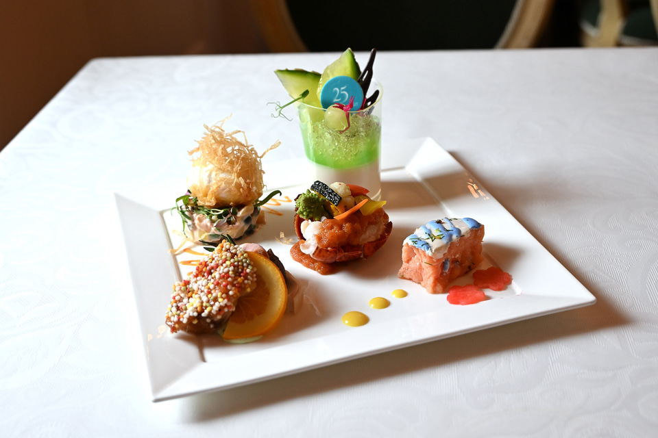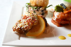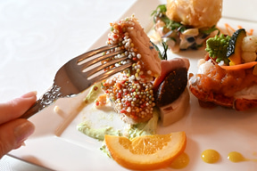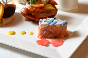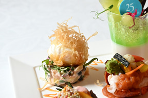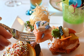 サーモンの低温調理/合鴨のオレンジ煮/イチジクのコンポート/チキンのガランティーヌ(ポーク、白レバー、ピスタチオ)/バジル風味のクリームチーズ/手羽先のガストリック/パートブリックを纏ったエッグのフリット/オマール海老のサラダ/メロンとパンナコッタ