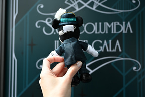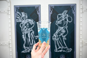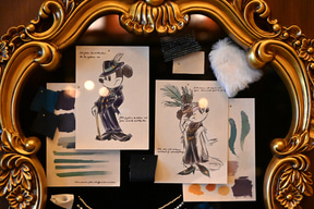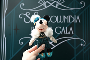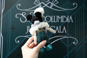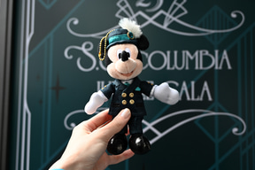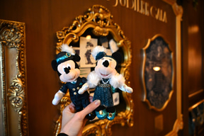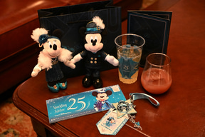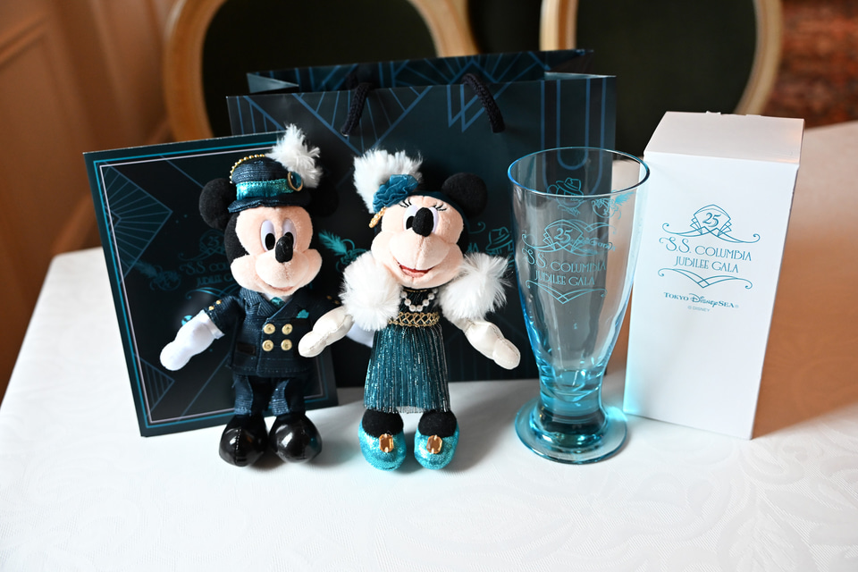 「ジュビリーガラ」の特典として注目しておきたいのが、このプログラムだけのオリジナルグッズだ。船内に飾られたスケッチと同じコスチュームのミッキーマウス、ミニーマウスのぬいぐるみバッジがセットで手に入るのだ。