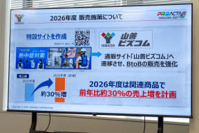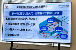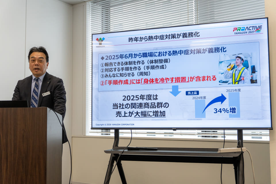 今年度の戦略として「これまでのような“点”での対策ではなく、作業者の身体を冷やす、作業空間を冷やす、休憩スペースを作る、そして緊急時に備えるという4つの“面”での提案を行なっていく」と語り、2026年度はさらに関連商品で前年比+30%の売上増を計画していると説明した。