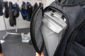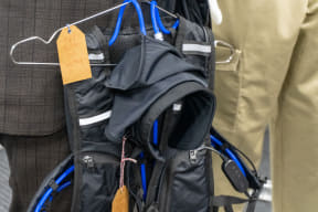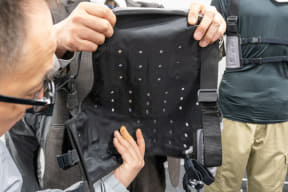 開発担当者によれば、従来品では水分を保持するために敷き詰めていた「中綿」を使用しない新構造であるため手入れがしやすく、ファン付きウェアと組み合わせて着用することで高い冷却効果を発揮するという。
