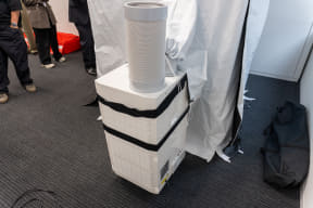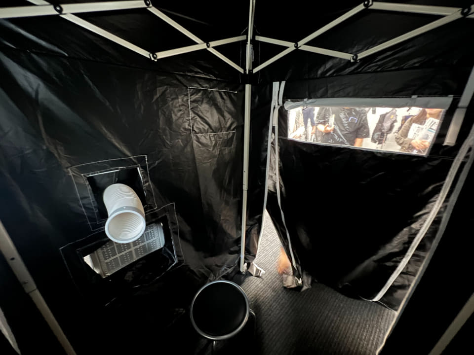 担当者によれば、よく作業現場などで活用される“仮設トイレを改造した休憩所”に比べて設置が容易であり、別売りのスポットクーラーとセットで購入しても9万9000円。10万円を切る価格設定のため、固定資産税の対象外として中小企業が導入しやすい点もメリットだ。
