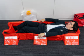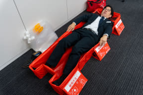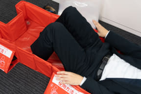 膝を曲げて仰向けになれば、身長175cm以上の人でも利用可能。「熱中症の応急処置においては足・膝を冷やす必要性は低く、主に上半身を冷やすことが重要となるため、まっすぐではなく、多少膝を曲げてラクな姿勢で仰向けになれる設計」とのことだ。
