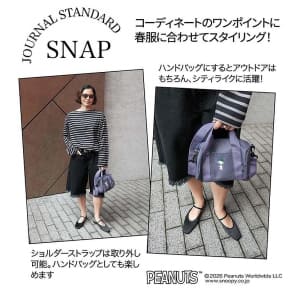 増刊号の付録は、登山スタイルのスヌーピーがかわいいピーナッツ×ジャーナルスタンダードのミニボストン。緑のハットをかぶって登山を楽しむスヌーピーの姿をワンポイントで刺繍しており、取り外し可能なショルダーストラップ付き。首から下げれば両手が空くので、アクティブなアウトドアシーンにもお勧めという。