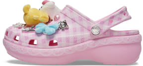 「ハローキティ アンド フレンズ クラシック プラットフォーム クロッグ」(大人向けサイズ:1万4300円)は、ピンクのギンガムチェック柄と小さくハローキティフェイスをプリントしたデザインで、約1.6cmのプラットフォームソールによるスタイリッシュなシルエットが特徴。