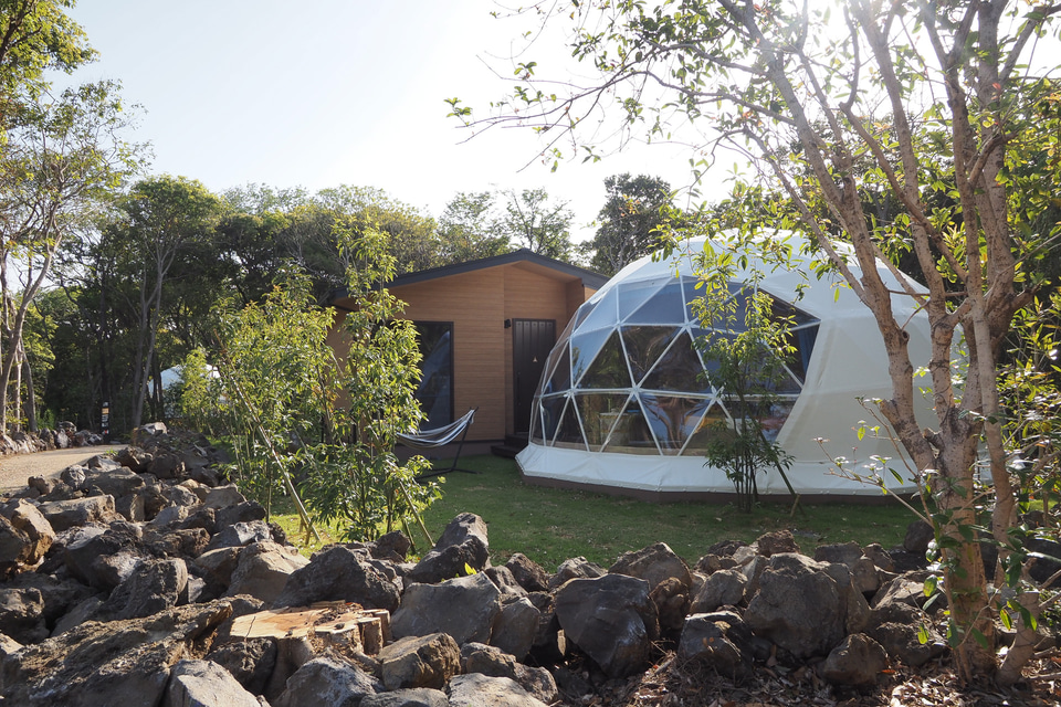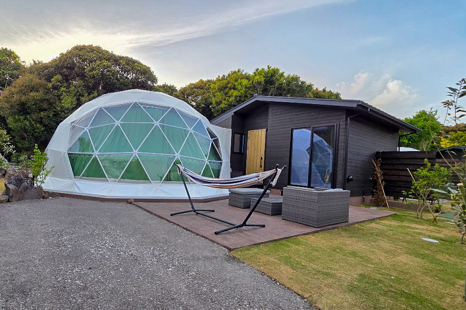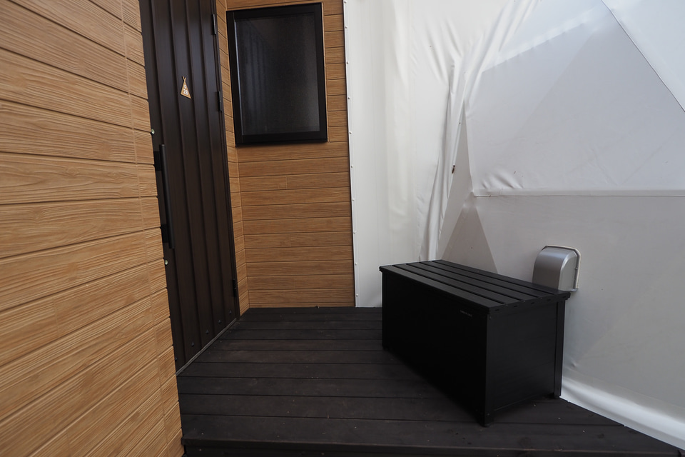 サイト内はドームテントとダイニングにトイレ、洗面所、シャワールームがあるダイニングスペースが直結しているのが特徴。トイレとシャワールームがついているのは、グランピングのなかでも利便性が高い。