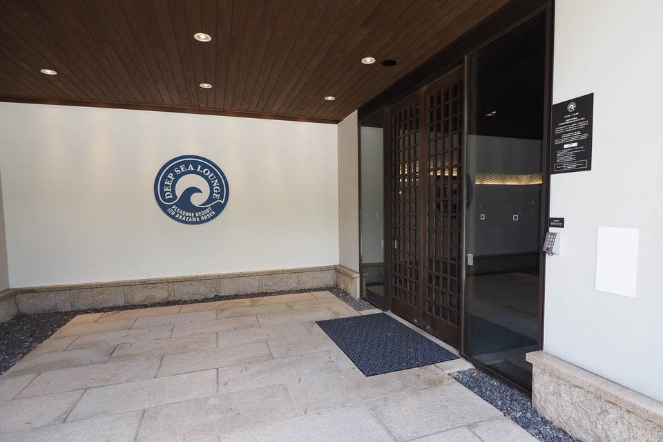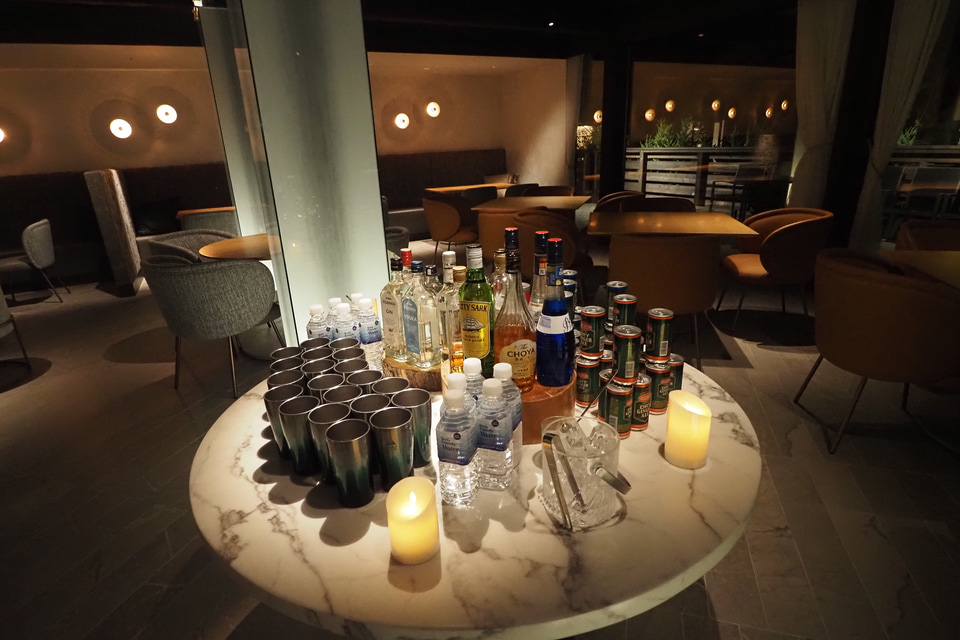 グラックスセンターへは、伊豆高原駅から施設の無料送迎バスに乗り、最寄りの「海洋深層水 赤沢スパ」前のバス停で降りて徒歩約5分。夜になると「カタラウンジタイム」として、無料のアルコール・ノンアルコール飲料を楽しめる。