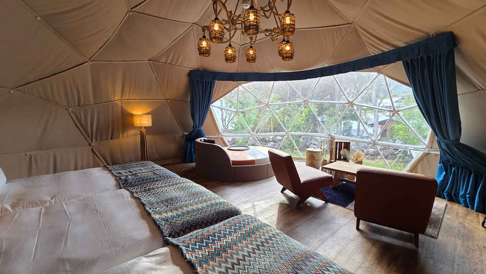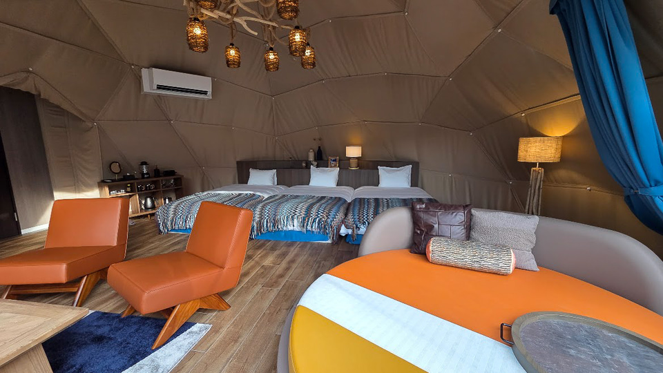 悪天候でも快適に過ごせるグランピングエリア