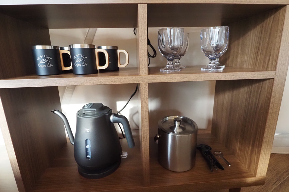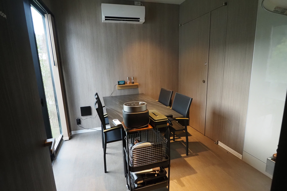 食事はダイニングスペースで調理していただく。屋外でないのでアウトドア感はやや薄れるが、空調を完備した部屋は過ごしやすく、雨などの天候に左右されずバーベキューが楽しめるのは利便性が高い。