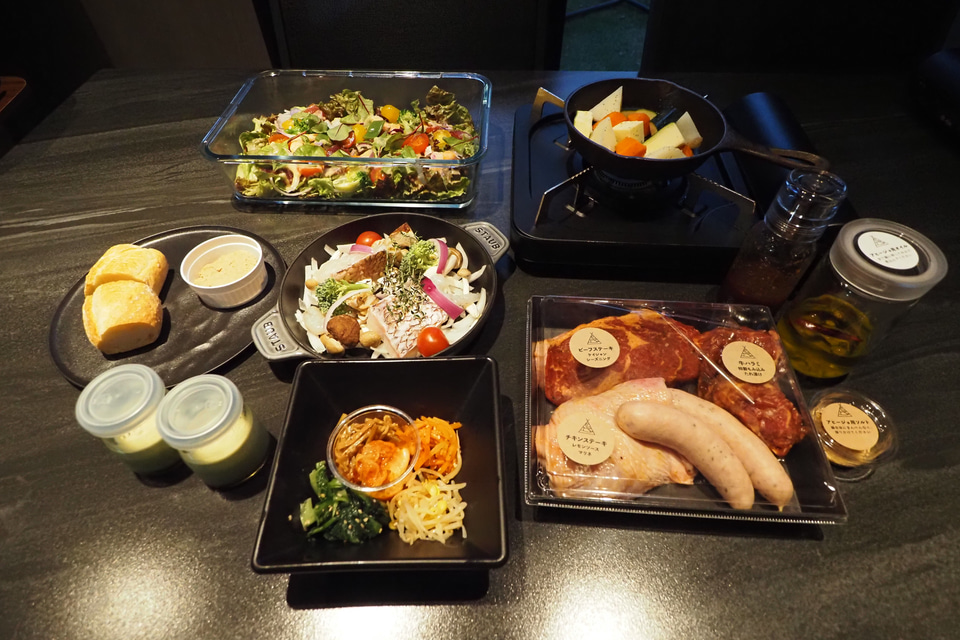食事は肉やソーセージのグリル料理から、漁業協同組合と提携して仕入れる伊豆の新鮮な海鮮を活かした料理までさまざま。チェックインの際にもらえる冊子に調理の手順や、器具の使い方、どの料理から作ればいいかというアドバイスが書かれており、スムーズに夕食の準備ができる。