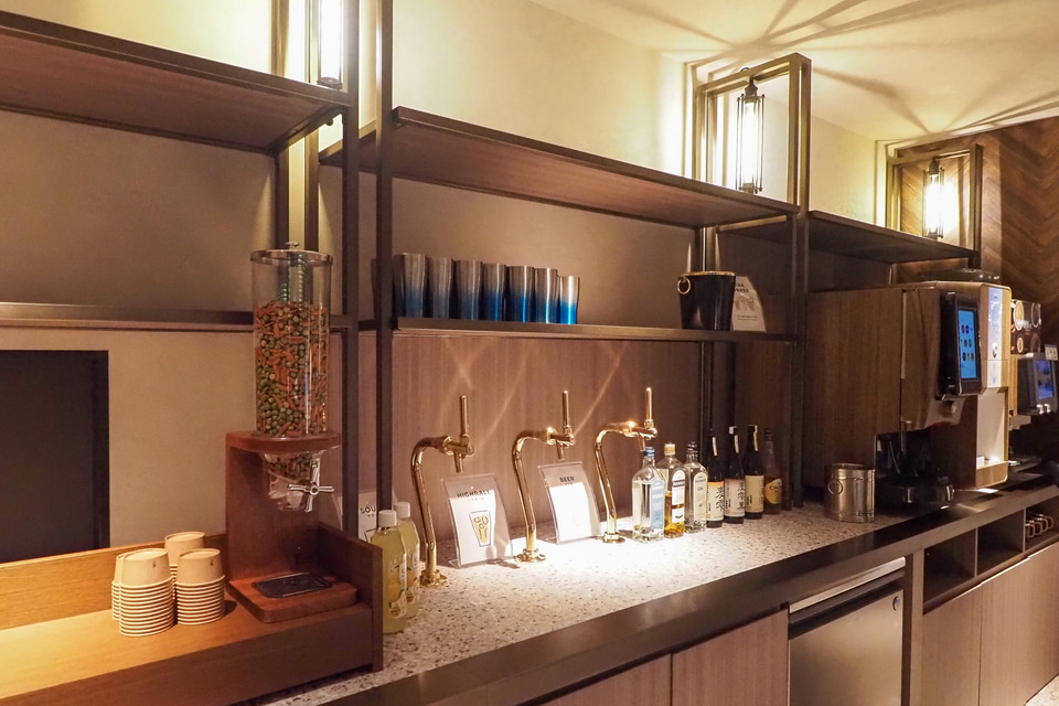 グラックスラウンジでは無料のアルコール・ノンアルコール飲料に加え、簡単なおつまみが楽しめる。ビリヤードや卓球、エアホッケーにダーツといった家族で遊べるコンテンツは、チェックアウト後も利用できる。