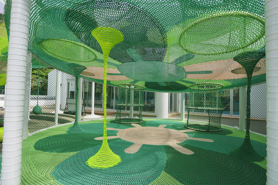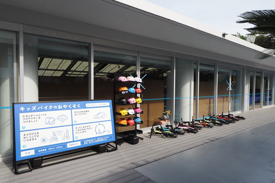 屋外では巨大な空中ネット遊具が大きな目玉となっており、乳幼児向けのキッズバイクのコーナーや、ゲームコーナーなども用意している。