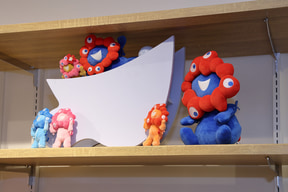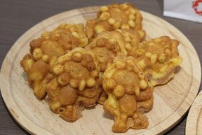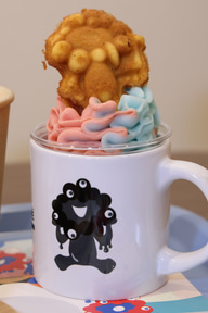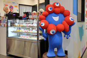 また、ミャクミャクの姿だったりプリントだったり色だったりと、ミャクミャク愛に満ちているテイクアウトメニューについては、どれも食感や味を違ったものにして楽しんでもらえる内容にしたという。今回は、大阪・関西万博の期間中に260万食を売り上げた「ミャクミャク焼き」に加え、生地や味を変えたアレンジバージョンの「もっちりミャクミャク焼き」も用意。「どちらも、ミャクミャクステッカーが付いてきます。また、もっちりミャクミャク焼きは1日100食限定で、季節によって味も色も変えていきます」。