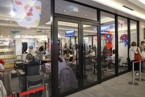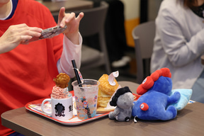 取材時は、10時に店舗がオープンした。イートインは予約番号順に待機列に案内され、オープン時に一斉に入店。なお、店内に滞在できるのは50分で、1時間ごとの入れ替え制。店内に入った客らは、食事が提供されるまで店内のミャクミャクのパネルやぬいぐるみなどを撮影し、その後一斉にテーブルに“マイミャクミャク”を並べて料理と一緒に撮影していた。よく訓練されたファンである。