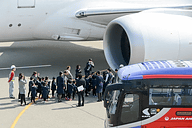まず、園児らは、関西国際空港の団体バス乗り場からバスに搭乗。ここで利用されたバスは、JALの関西~ロサンゼルス線就航を記念したラッピングバスだ。そして、ランプへとバスが到着すると、CA(客室乗務員)や地上スタッフ、整備士らに迎えられ、初便に使われるボーイング787-8(JA823J)の前へと降り立った。