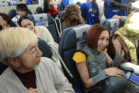 西日本を巡ってくる遊覧フライトではあるものの、機内はスター・ウォーズのコスチュームを身にまとった人達を中心に大変な盛り上がりで、機外の風景はどこへやらの雰囲気。報道陣による撮影やインタビューはもちろん、コスチュームをまとった人同士での記念撮影も活発で、賑やかと言ってよいのか、カオスと言ってよいのか、とにかく飛行機のなかとは思えないような、不思議で、そして楽しさにあふれた時間が流れていた。