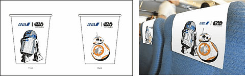 すでに公開されている「R2-D2 ANA JET」と同じく専用デザインの紙コップやヘッドレストカバ-を使用。11月19日12時~14時には、伊丹空港の格納庫でデカール貼付作業などの機体見学会を実施。見学会はANAのFacebook(https://www.facebook.com/ana.japan/)でペア15組30名を募集する。募集期間は11月5日17時30分~8日23時59分。