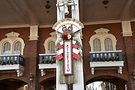 東京ディズニーランドのワールドバザールの入り口には、干支の申をモチーフとしたデコレーションの門松が登場。中央部分の扇の中には、謹賀新年の文字とともに「ジャングル・ブック」のサルの王キング・ルイの姿も。シルエットのモンキーたちと華やかな色の花々で彼らの陽気で明るいイメージを表わしていた。また、胴部分にはミッキーシェイプがあるなど細部までこだわりも。