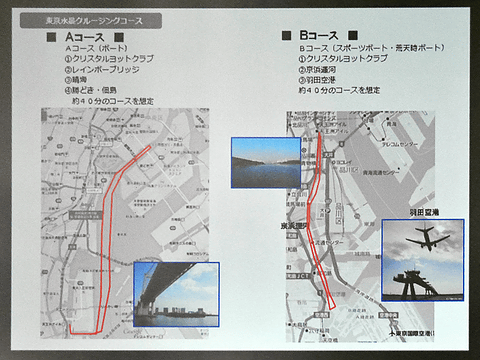 続いて、同社マリン事業本部東日本ソフト課の堀越宜秀氏が登壇し、試乗艇やコース、注意事項などを説明した。今回、試乗艇として用意されたのは、今年春から導入されたSR310のほか、S-QUALO(エスクアロ)、LUXAIR(ラクシア、2艇)、AR190、FR-23の5種類6艇。体験クルージングは2コースに分かれ、Aコースがレインボーブリッジ、晴海、勝どき、佃島を巡る約40分のコース。BコースはスポーツボートAR190のみとなり、THE CRUISE CLUB TOKYOから京浜運河を通り、羽田空港までを往復する約40分のコースとなる。
