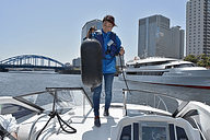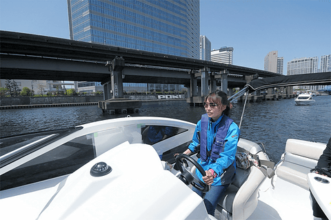 試乗するSR310を操縦するのは、ニューポートマリンクラブのニューポート江戸川に所属する藤田亜耶キャプテン。筆者が乗船すると、藤田キャプテンは静かにエンジンをかけた。350PSのV8エンジンの船外機だが、その音はとても静か。あまりに静かなため、エンジンがかかっているにも関わらず、セルを回そうとしてしまうこともあるとか。