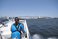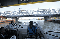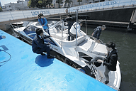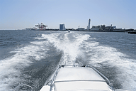 品川埠頭と大井埠頭を結ぶ若潮橋(都道316号)をくぐり、左に品川火力発電所、右に大井火力発電所を見ながら、次第に視界が開けてきてスピードアップ。左にターンし、レインボーブリッジを目指す。速度はすでに20ノット。時速にすると40km/h弱だが、視点が水面に近いことと風の影響もあり、体感速度は倍以上だ。SR310は、条件がよければ40ノット(約74km/h)は出せるという。