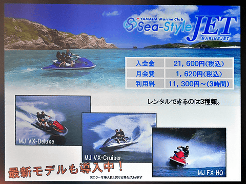 シースタイル ジェットでは、「MJ-VX Deluxe」「MJ-VX Cruiser」「MJ-FX HO」の3種類のマリンジェットと、8人乗りスポーツボート「AR190」(1級または2級船舶免許が必要)をレンタルできる。レンタル代は平日3時間で1万1300円から。