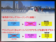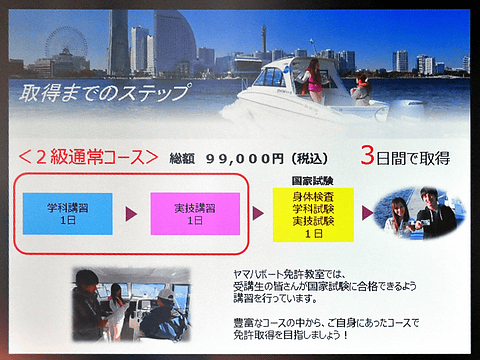 また、すでに2級を取得している人向けに、1日半で1級にステップアップする「1級ステップアップコース」、1日半でマリンジェットが乗れるようになる「特殊小型学科セルフコース」などもある。