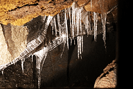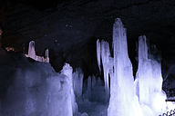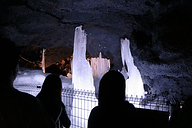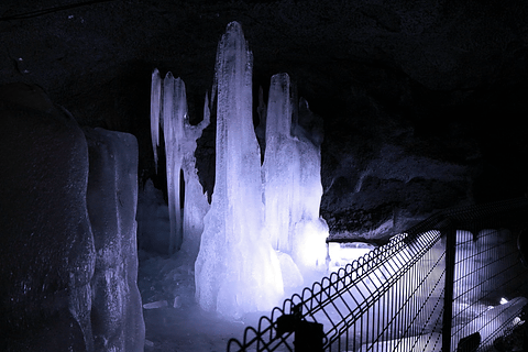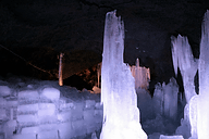 洞窟内は約3℃。ライトアップされた氷柱が幻想的な「富岳風穴」