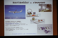 シートには各座席に約11インチの操作性に優れたモニターを備え、人気ブランド「マリメッコ」とのコラボレーションアメニティ「marimekko for Finnair」を用意。ヘッドレストカバーや機内食に使われる食器類もコラボモデルであり、エコノミークラスでもブランケットや紙コップなどでそのデザインを楽しめると紹介した。関空旅博2017のフィンエアーのブースでは、このブランケットや紙コップなどを実際に展示している。