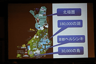 フィンランドは南北に長い国土で、首都は南部にあるヘルシンキ。北部は北極圏「ラップランド」となっており、国土の1/3がラップランドとなる。氷河がとおったあとにできた18万の湖や、3万の島々からなる南の群島エリアなどが、国土の特徴と説明。