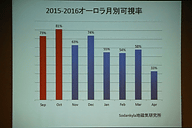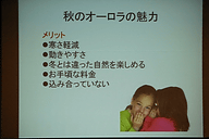 フィンランドといえばオーロラ鑑賞を旅の目的にする人も多いが、実は冬よりも秋にオーロラに出会える可能性が高い調査結果もあると紹介。さらに寒さもまだ厳しくなく、ホテルは冬がオンシーズンのためその前の時期で割安であり、フィンランドを訪れるなら秋がお勧めだと話した。フィンランドでは湖面に映る「ダブル・オーロラ」を楽しめる可能性があり、これは他国のオーロラが大地や海の上に見えることとの大きな違いであるという。