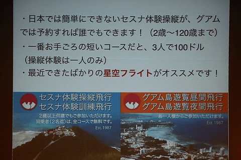 グアムのアクティビティで最近人気なのが、マイクロネシアンエアーが実施するセスナ体験操縦飛行で、プロのパイロットが同乗することで、セスナで操縦桿を握って空を飛ぶことができるという。日本ではもちろん簡単にはできないセスナ体験操縦が、グアムでは予約すれば1番短い手頃なコースなら3人(操縦桿を握れるのは1人)で100ドル(約1万1100円、1ドル:111円換算)で楽しめるとのこと。特に星空フライトがお勧めで、グアムの夜景はきれいで、空気が澄んでいれば南十字星と北斗七星を同時に見られることもあるそうだ。