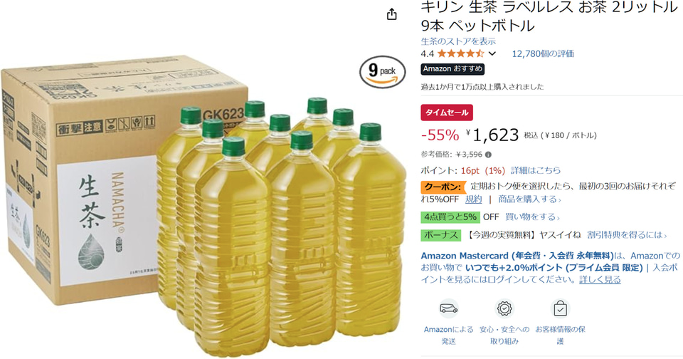 Amazon(アマゾンジャパン)は、キリン「生茶」ラベルレス2L×9本のセールを行なっている。通常3596円のところ、記事執筆時点では55%オフの1623円(1本あたり180円)。