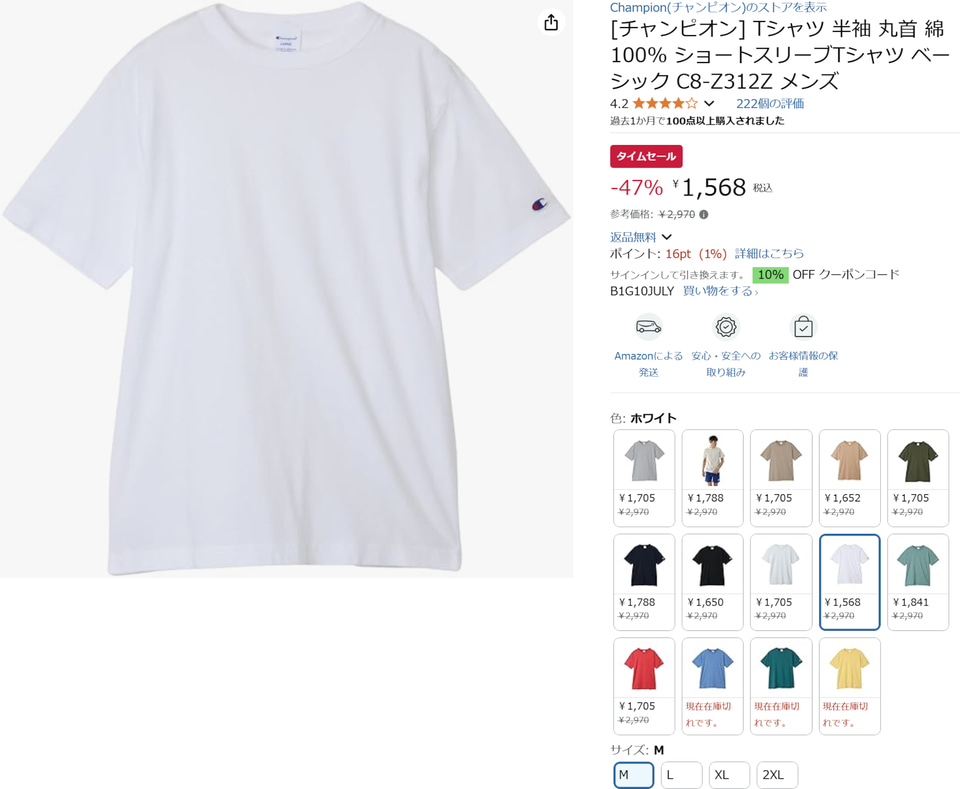 Amazon(アマゾンジャパン)は、チャンピオン ショートスリーブTシャツのタイムセールを行なっている。通常2970円のところ、記事執筆時点では最大47%オフの1568円~(ホワイトMサイズの場合)。