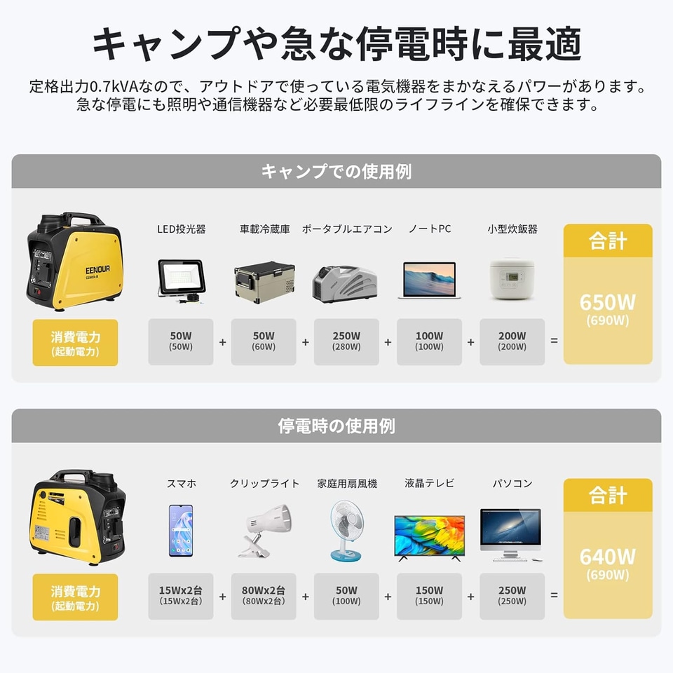 Amazon(アマゾンジャパン)は、EENOURの「インバーター発電機GS900i-B 0.7KVA/700W」のタイムセールを行なっている。通常6万9900円のところ、記事執筆時点では31%オフの4万7899円。