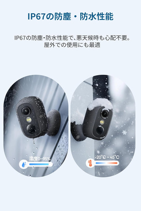 マグネットで簡単に設置できるワイヤレスタイプの屋外用防犯カメラ。IP67の防塵・防水性能を持ち、湿度0~95%、気温-20~45℃の環境でも動作する。磁力の効く箇所なら自由な設置が可能で、シャッターや雨どい、ポスト、ベランダの手すりなどに取り付けられる。付属のねじ、別売りの取り付け金具での固定にも対応。