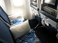 エコノミークラスは3-4-3の配列で、今回私は左側3席の真ん中でした。シートは人間工学的なデザインを採用しているそうで快適。ちなみに下の写真、左隣は190cmはあろうかというオランダ人男性で、私が小さすぎるということではありません念のため。