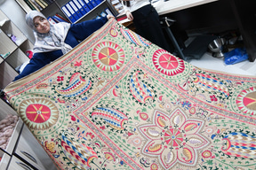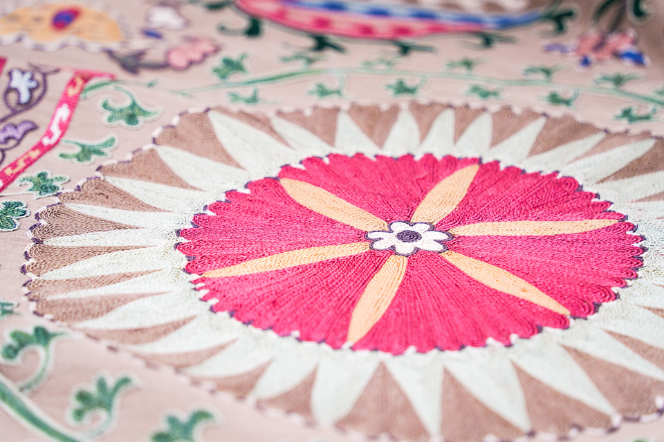 ウズベキスタンに関わらず中央アジア諸国では、さまざまなパターンの模様が刺繍されたスザニが生活に入り込んでいる。地域の伝統として、手刺繍で受け継いできた技術だ。