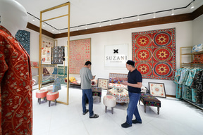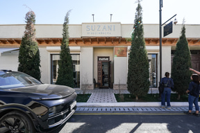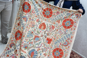 「Suzani by Kasimbaeva(カシムバエワのスザニ)」(Suzuk Ota 35, Tashkent)という工房兼ショップで手刺繍のスザニが作られている工程を見学した。室内の仕切りや壁掛けに使われることが多いとのこと。また、古くは結婚時の持参金としての役割もあった。現在では、服やクッション、アクセサリーなどに刺繍も行なわれているが、天然染料を使った手縫いという伝統は引き継いでいる。お土産にもぴったりだ。