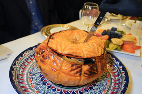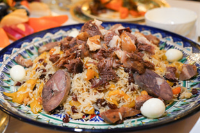 ディナーを食べながら、伝統舞踊などが楽しめる「Obi Hayot」(4 Jarqo'rg'on ko'chasi, Obi Hayot, Tashkent)というレストランを訪れた。市街からは離れていて、タシケント空港の近くになるので、訪れるにはクルマ(もしくはタクシー)が必要になるが、ディナー時間は終始、ウズベキスタンの伝統音楽や舞踊のショーが行なわれているので、これを見に行く価値は十分にある。もちろん食事も、ウズベキスタンの代表的なメニューを楽しむことができた。見てもらうと分かるが、豚肉以外で肉多めの料理が多い。