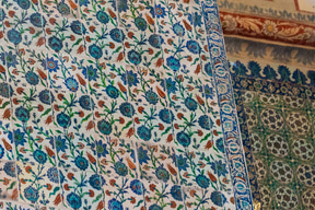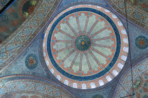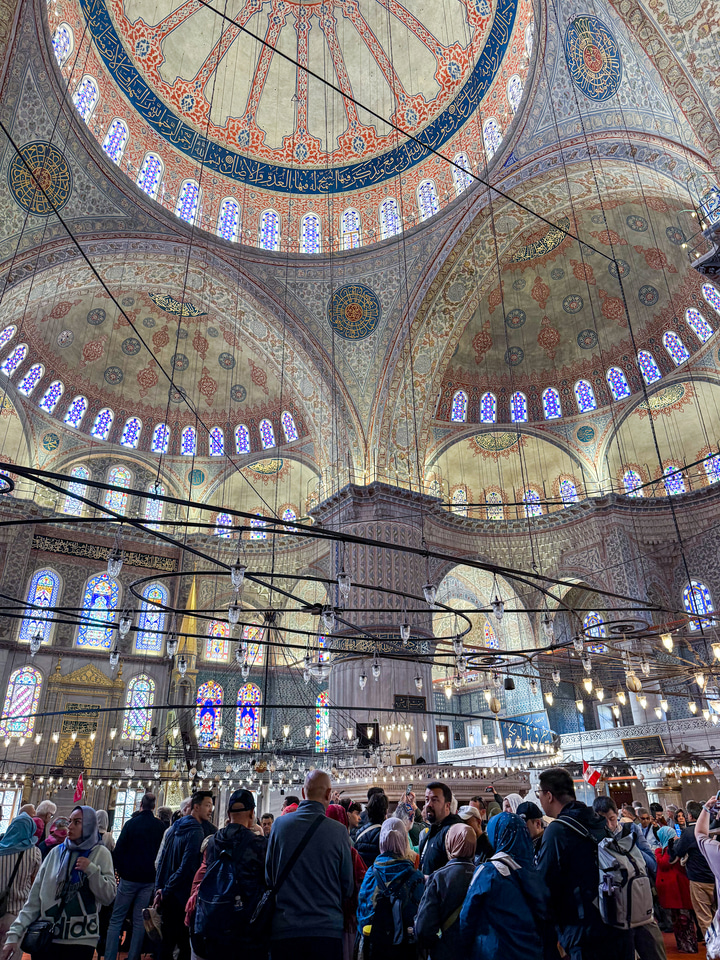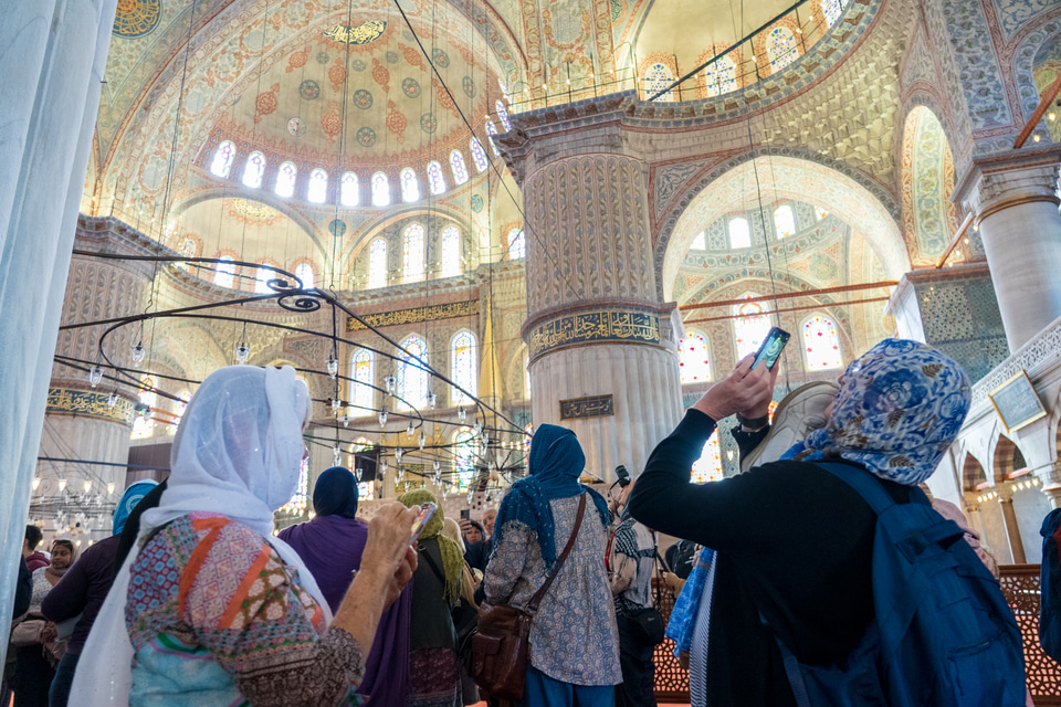 最初に向かったのは、スルタンアフメット・ジャーミィ、通称「ブルーモスク」です。6つのミナレット(尖塔)を持つ優美な外観もさることながら、万華鏡を覗いているかのような内部のタイル装飾に圧倒! ステンドグラスを通して差し込む柔らかな外光がモスク内を包んでいたのが印象的でした。