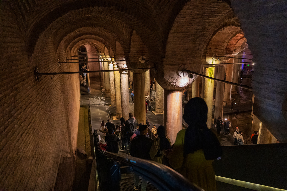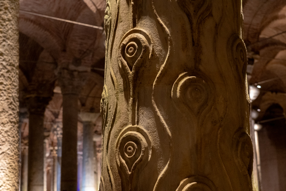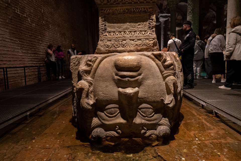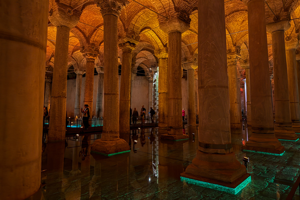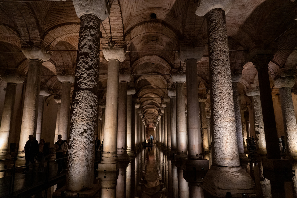 宮殿といっていますが実はここ、西暦500年代の東ローマ帝国時代に造られた大貯水槽。飲水が貴重だったその昔、コンスタンティノープル(現イスタンブール)の全市民に2週間以上水を供給できるほどの大きな地下貯水池だったとか。