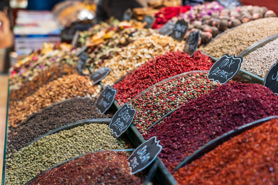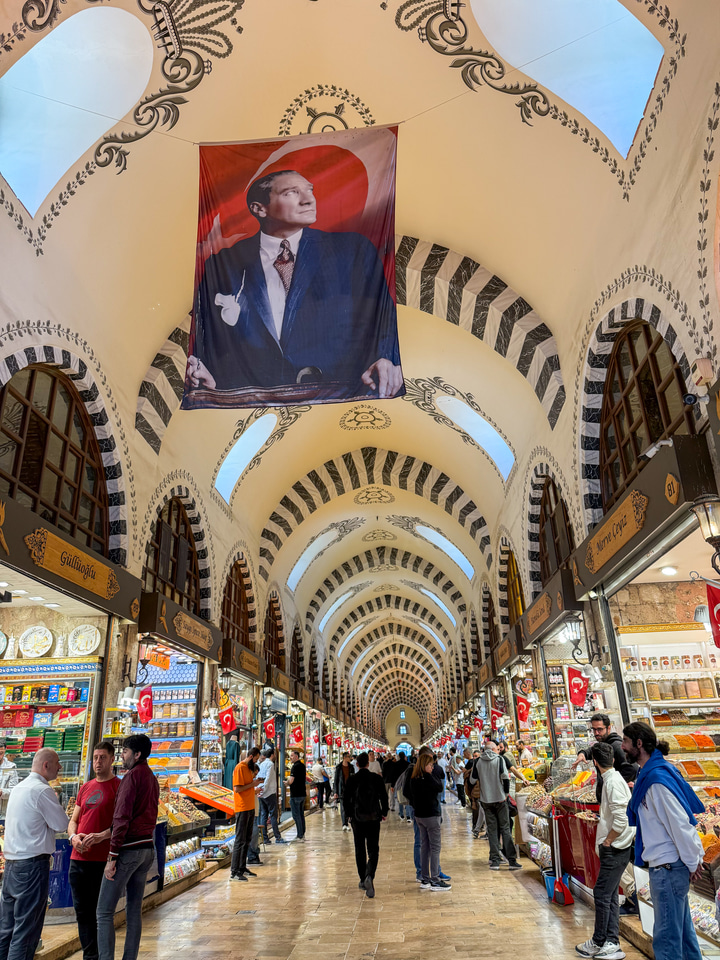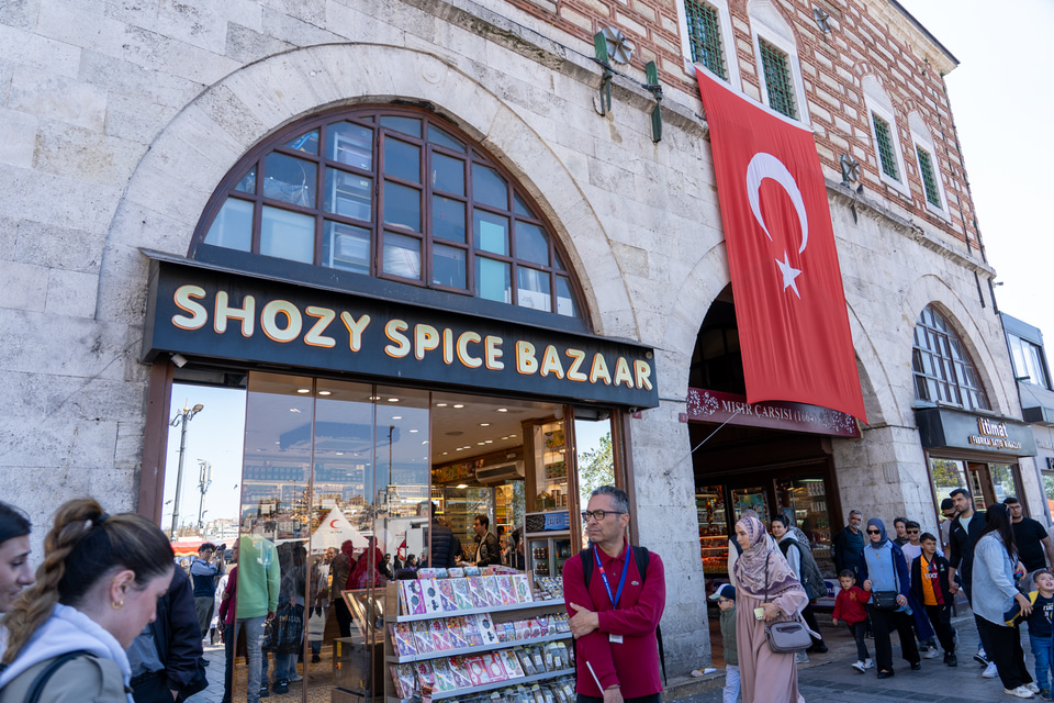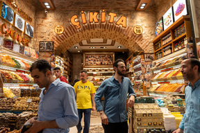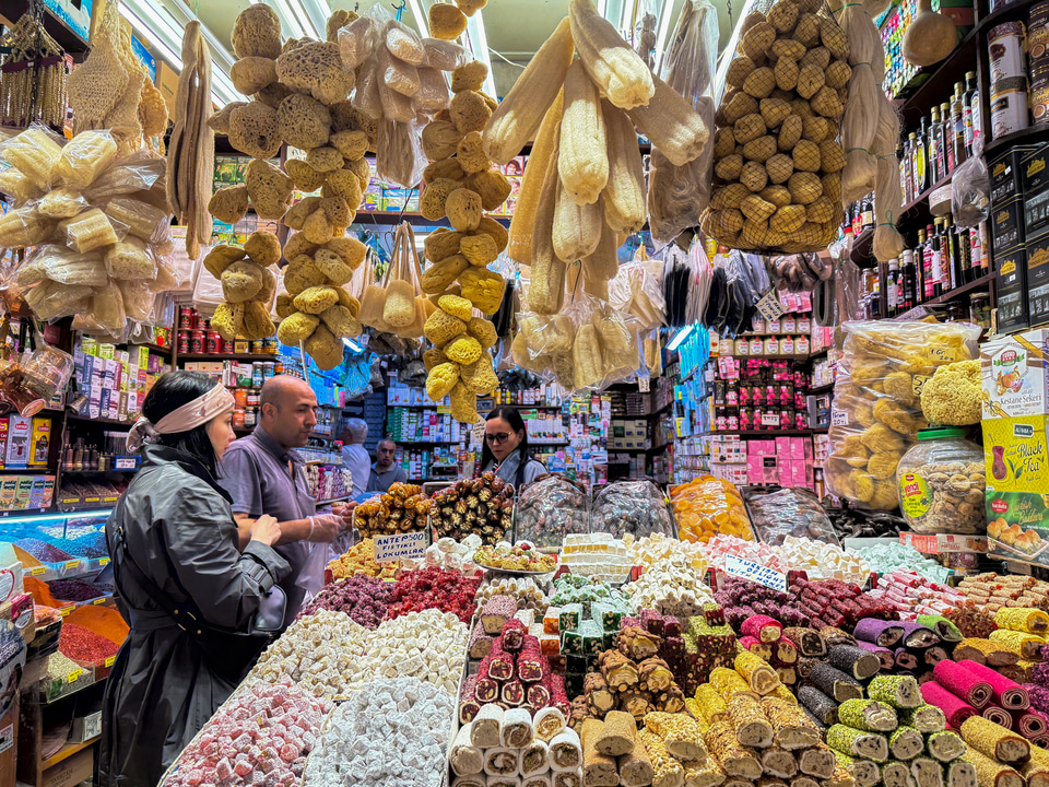 旧市街から新市街へ戻る途中、最後に立ち寄ったのがエジプシャンバザールです。“スパイス・バザール”の別名があるとおり、カラフルな香辛料やドライフルーツ・ナッツやお茶など量り売りの乾物がずらり。ここでは両替したトルコリラを初めて使いました。