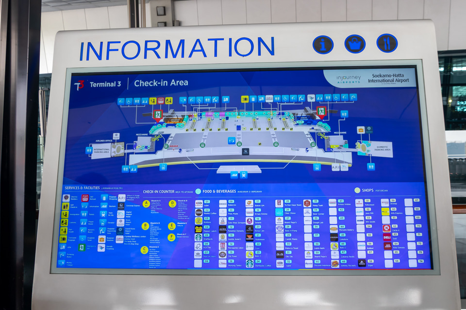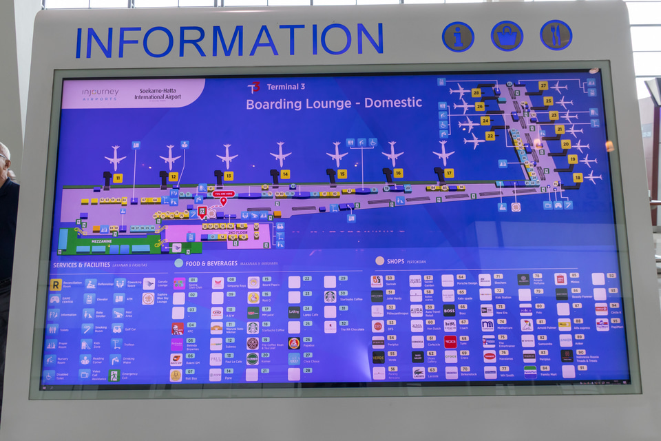 ジャカルタから広大なインドネシアの各都市に向かう場所柄であるため、時計はWIB(西部標準時)、WITA(中部標準時)、WIT(東部標準時)の時刻を示すものが設置されており、改めて大きな国だなぁと思った。ちなみにジャワ島やスマトラ島はWIB、バリ島やスラウェシ島などはWITA、日本と時差のないWITはパプアなどが含まれる。