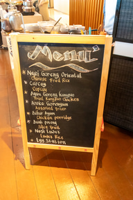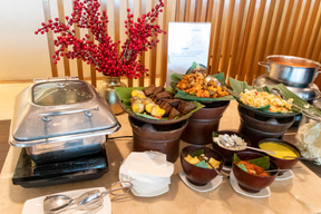 落ち着きのある室内には一人掛け用ソファや二人掛け用ソファが数多く設置されており、ゆっくりとくつろげる。ホットミールをビュッフェスタイルで潤沢に提供しており、インドネシア版チャーハンの「ナシ ゴレン」や、鶏を使ったお粥「ブブル アヤム」、スパイシーなフライドチキン「アヤム ゴレン」などが楽しめる。