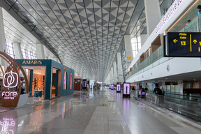 今回もスカルノハッタ空港で利用したのはターミナル3で、国際線で到着した左側ではなく、国内線は右側のエリアになる。ターミナルの正面から入って、左は国際線、右は国内線と、シンプルで分かりやすい。空港内に続くゲートは1~5番まであり、国際線に近いのは1番、国内線に近いゲートは5番になる。