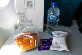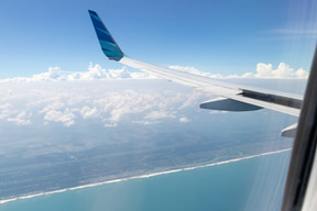GA208便でジョグジャカルタまでは約1時間20分のフライト。窓側の席を用意してもらえたので、大都会のジャカルタから緑豊かな山々、インド洋沿いの美しい海岸線などを眺めることができた。短いフライトだったが、機内で軽食(パン、ミックスナッツ、ミネラルウォーター)を提供してもらえたのはうれしい限り。